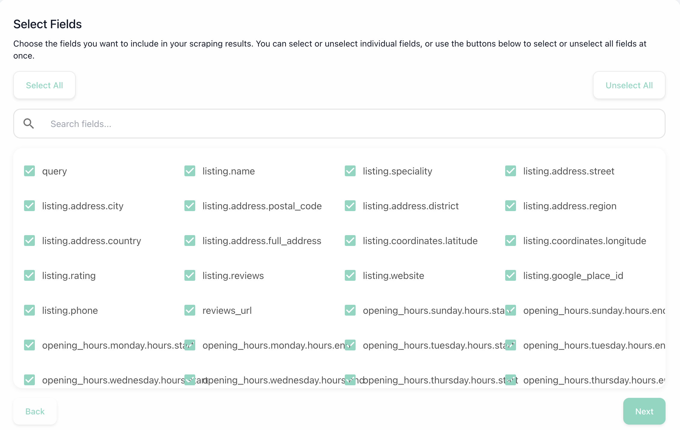Choose the data to extract: name, phone, address, reviews, opening hours...