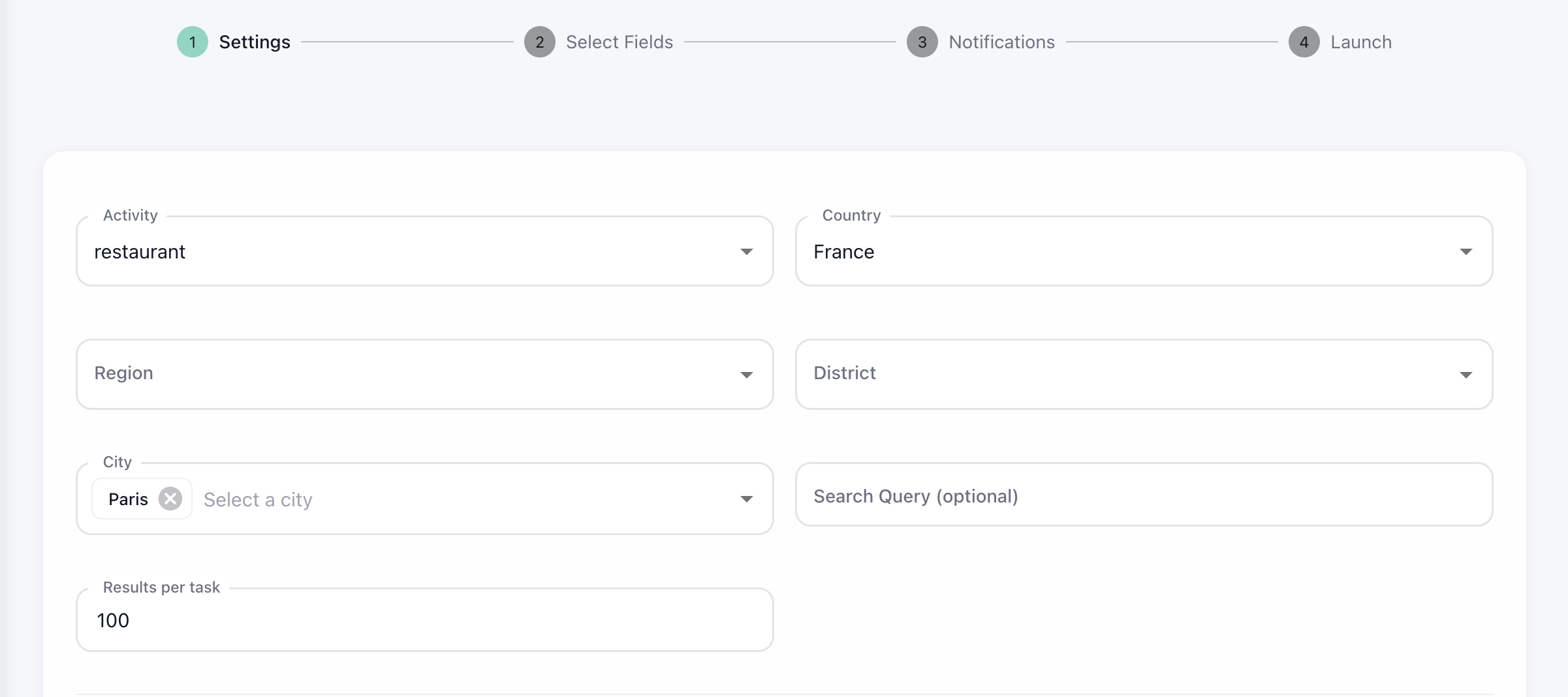 Select from our scrapers and configure your criteria: location, category, volume.